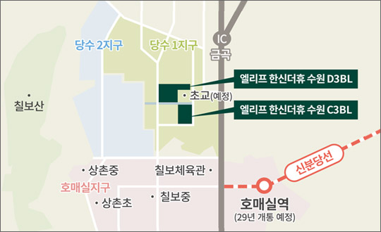 단지 앞 당수천 수변공원(예정)과 당수공원(예정), 중심상업지구(예정), 호매실 상권 등 다양한 인프라